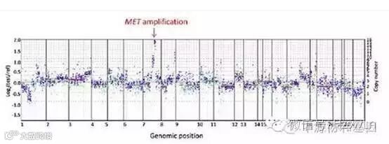 采用二代测序技术检测182肿瘤相关基因的整个编译序列,以及14个在肿瘤中高频重排的基因的36个内含子。结果表明:该患者肿瘤组织中存在MET、CCND1、MYC基因扩增,以及KRAS G12V, TP53R273L 及 CARD11 N184S 突变。曾有报道表明MET扩增的非小细胞肺癌患者对克唑替尼有抗肿瘤反应。基于这个证据,该患者接受了克唑替尼治疗。