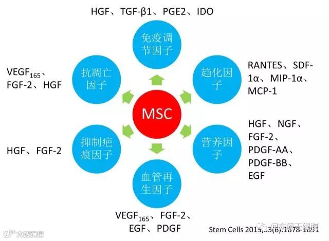 越来越多的证据支持,输入的MSCs发挥修复损伤组织器官的治疗作用不在于分化替代,而是在于MSCs通过分泌多种细胞因子,通过细胞因子来执行修复能力。