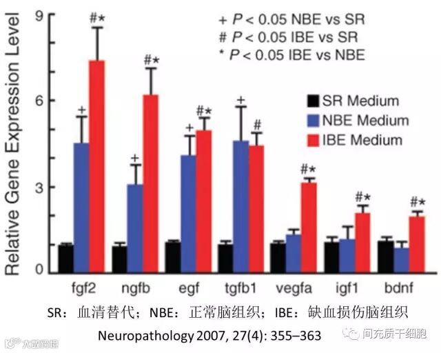局部注射MSC能明显改善大鼠大脑缺血区的血供,减少缺血性中风后的脑损伤面积,改善脑神经的功能,经过MSC治疗后,局部脑损伤组织的生长因子(VEGF和bFGF)表达增多,促进血管的新生[14]。创伤性脑组织和缺血区大脑组织制备的提取液能促进MSC多种神经营养性生长因子的表达,包括bFGF、IGF-1、VEGF-A、NGF、BDNF、EGF、HGF等,直接证明了大脑损伤微环境能激活移植的MSC分泌更多的治疗性细胞因子[15, 16]。