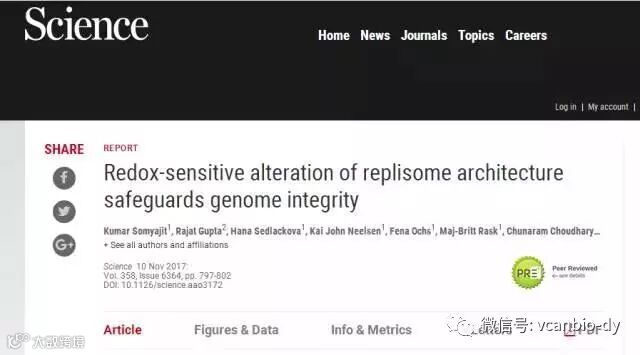 来自丹麦哥本哈根大学的研究人员于11月10日发表在《科学》杂志上的文章揭秘了答案。这篇名为“Redox-sensitive alteration of replisome architecture safeguards genome integrity”的文章揭示了人体DNA复制过程中,可以减缓DNA复制速度的关键蛋白。