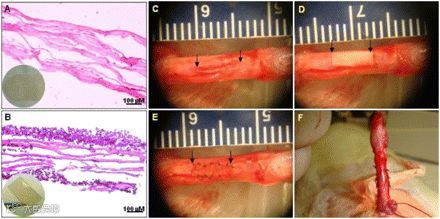 SIS-ADSC grafts and reconstruction surgery of TA. (A) Four-layer SIS showed nondirected fibers, which were completely acellular. (B) H&E staining demonstrated that ADSCs engrafted and formed multiple layers on the SIS scaffolds. (C) Rat penis middle section was chosen as the surgery site. Rats underwent first stage surgery, which included a 5-mm incision (arrows) on both sides of the TA. (D and E) A 10 mm2 SIS and stem cell-seeded SIS (arrow) was interpositioned and sutured with 8-0 nylon for the third or fourth groups. (F) All excisions for tunica grafting were performed laterally to protect the dorsal cavernous nerves from injuries.