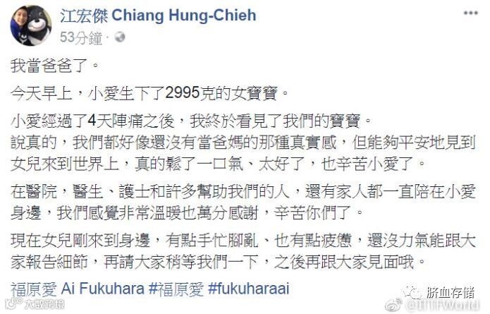 “我当爸爸了。今天早上,小爱生下了2995克的女宝宝。小爱经过了4天阵痛之后,我终于看见了我们的宝宝。说真的,我们都好像还没有当爸妈的那种真实感,但能够平安地见到女儿来到世界上,真的松了一口气、太好了,也辛苦小爱了。在医院,医生、护士和许多帮助我们的人,还有家人都一直陪在小爱身边,我们感觉非常温暖也万分感谢,辛苦你们了。现在女儿刚来到身边,有点手忙脚乱、也有点疲惫,还没力气能跟大家报告细节,再请大家稍等我们一下,之后再跟大家见面哦。”(江宏杰个人脸书)