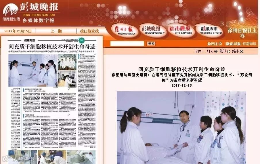 2015年,徐医附院风湿免疫科在淮海经济区率先开展了间充质干细胞移植技术的临床实验,治疗一些难治、危重的结缔组织疾病,比如干燥综合征、硬皮病等,至今为止,这项技术已经使得33例患者受益,在这一阶段使用此疗法的患者中,有效果的占到七成。