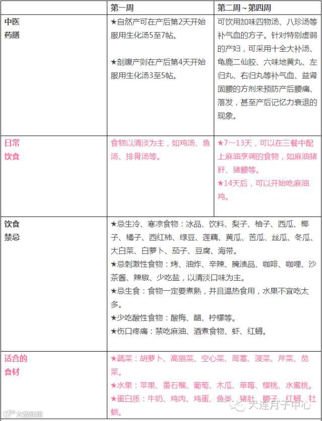 产后第一周妈妈的身体属于“多虚多淤”的特性,建议可以服用生化汤,有帮助恶露排出、减少产后腹痛的功效,食物则以清淡为主,如鸡汤、鱼汤、排骨汤等。 但若伤口还有红肿疼痛时,则禁吃麻油、酒煮食物、虾和红蟳,建议产妇可咨询中医师后再选择适合的药方。