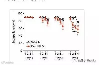 注射脐带血血浆的小鼠(红色圆圈)和空白对照组小鼠(黑色圆圈)迷宫实验中几次找到正确出口所需的时间