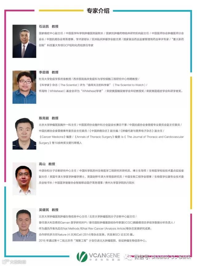 本次卫星会上,美国杜克大学免疫学系李启靖教授,北京大学肿瘤医院陈克能教授,中源协和分子诊断研究中心主任、中国科学院苏州生物医学工程研究所高山教授,北京大学肿瘤医院肿瘤生物信息中心吴健民教授将聚焦精准医疗和肿瘤治疗,为大家带来精彩的演讲。最新鲜的科技成果、最前沿的科技资讯、最具洞察力的独到见解……都将在他们的精彩发言中一一展现。