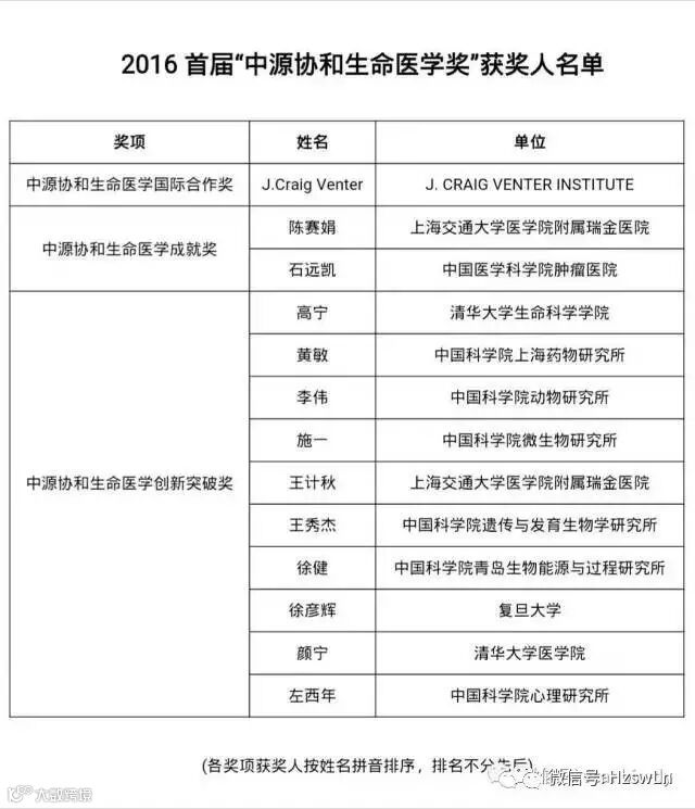 2016首届“中源协和生命医学奖”获奖人名单公示如下:
