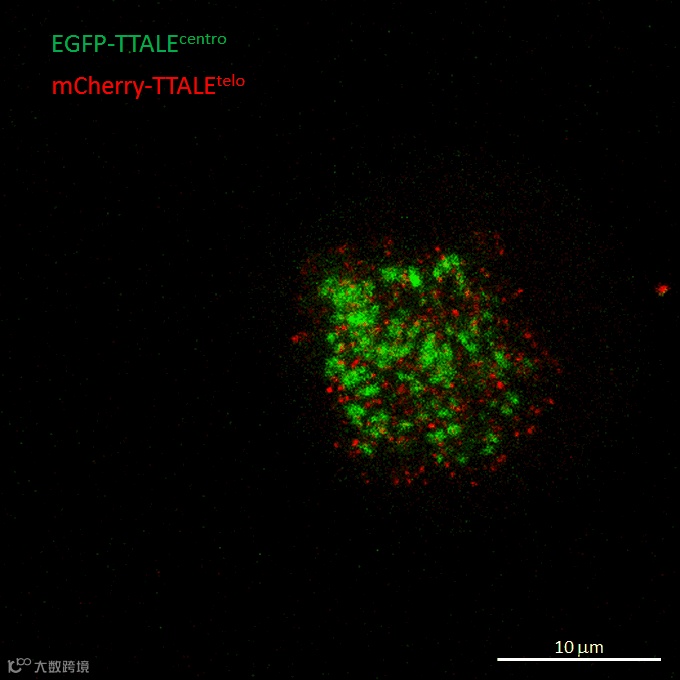 Movie 1.利用TTALE成像系统实时观测HeLa细胞有丝分裂过程中端粒和着丝粒的动态变化。