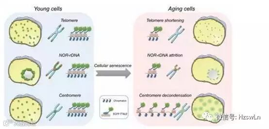 人类衰老和许多衰老相关的疾病都伴随着染色质结构的改变或异常,因此探索染色质结构的动态变化对于深入理解衰老及衰老性疾病的机制具有重要的意义。基因组重复序列是隐含在人类基因组中的“暗物质”,通常被包裹在致密的异染色质中,并且被认为是无用的“垃圾序列”。由于研究手段的限制,在现有的大多数基因组信息分析中,这些“垃圾序列”往往会被主观地“忽略”掉。人们所熟知的端粒其实也是一种基因组重复序列,而端粒的缩短已经成为衰老研究领域中为数不多的重要分子标记物之一。尽管如此,对于衰老是否伴随更为广泛的基因组重复序列的改变,目前人们还知之甚少。利用TTALE成像系统,研究团队发现核仁区核糖体DNA拷贝数的减少可能是人类衰老的生物钟之一。人类衰老所伴随的核仁区核糖体DNA拷贝数的减少同端粒的缩短同样显著,并且可以方便地在老年人的外周血中检测到,因此可以用作评价人类衰老进程的新型分子标志物。此外,研究人员也利用TTALE系统在培养皿中观测到了细胞衰老伴随的端粒缩短和着丝粒异染色质失序等基因组结构的变化,并且首次在体内单细胞水平观察到了端粒酶缺失小鼠的端粒加速缩短现象。