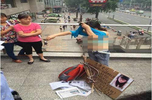 2015年8月31日上午,一名女子穿着内衣、背着木条出现在成都春熙路的跨线天桥上,以负荆请罪的姿态寻找自己的女儿。