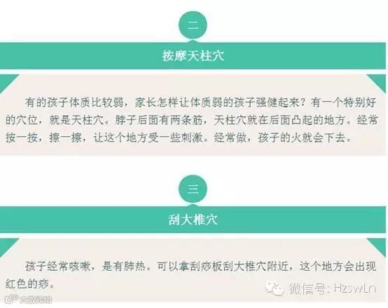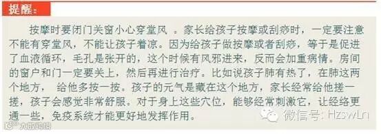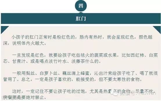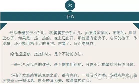 后来,我按照她的方法做,很有成效,而且我自己还总结出一个经验: 每次孩子临睡,把你的手搭在孩子脑后,从大椎一直往下摸,如果发现哪一处温度比别处高,比如肺俞高,对应的是肺,那么孩子肺内有热,就要想办法把肺火祛了;看看是不是大便干了,要是干,就得泻泻,吃点百合粥,凉拌莴笋丝,或是空腹喝点香油冰糖水也行。