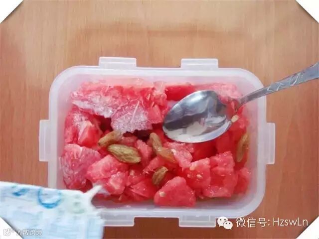 6、当西瓜遇上葡萄干把西瓜切个盖儿,然后放一把碎葡萄干进去,再盖好在冰箱里冰一下午。