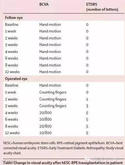 2010年,美国ACT公司(advanced celltechnology)获得FDA许可,利用胚胎干细胞衍生的视网膜色素上皮细胞(RPE)对治疗两种退行性眼疾病:干性年龄相关性黄斑变性(Dryage-relatedmacular degeneration,AMD)和少年型黄斑营养不良(Stargardt病)。这是FDA批准的涉及到源自人类胚胎干(hES)细胞的第二项临床试验。2012年,该研究机构在《柳叶刀》(The Lancet)杂志发表了一篇文章《Embryonic stem cell trials for macular degeneration: apreliminaryreport》[5],美国研究人员利用人类胚胎干细胞(hESC)治疗了两名患有不同退化性眼疾病的患者,初期数据表明hESC治疗不仅安全,且显示出了一些治疗效力。他们将hESCs诱导生成了早期骨细胞和神经组织细胞,随后这些细胞分化形成了视网膜上皮细胞,其纯度超过99%。研究人员将大约5万个分离出来的视网膜上皮细胞注入到两名患者的视网膜下,其中一名老年女患者在其70多岁时患上了干性年龄相关性黄斑变性,而另一名中年女患者则患有Stargardt病,因而导致了二者失明。4个月后,研究人员发现RPE已被注入的视网膜上皮细胞完全取代,数据证实注入的细胞存活了下来,并很大程度上改善了她们的视力。(如表2.)