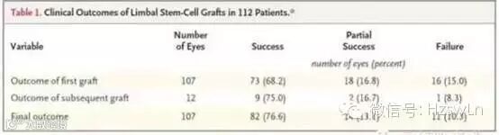 在2010年,N Engl J 杂志发表了一篇文章《Limbal Stem-Cell Therapy and Long-Term Corneal Regeneration》[4],意大利研究人员用病人自身角膜缘干细胞治疗角膜损伤。在患者的眼白和角膜间的异组织边缘提取干细胞,待其发育为纤维组织后,再植入患者的眼睛受损部位。112名被化学灼伤而导致失明的患者进行治疗,结果超过四分之三的患者恢复了视力。该技术一次移植成功率为68.2%,二次移植成功率为75%,还有13.1%患者的视力获得部分改善,仅有10.3%的患者视力无法获得改善。(如表1.)该研究发现P63阳性细胞比例对于治疗成功很重要。