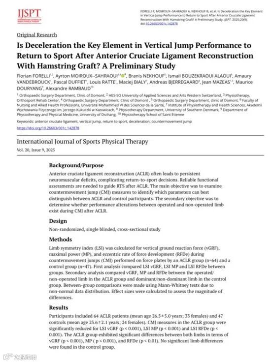 《国际运动物理治疗杂志》论文。祝贺弗洛里安·福雷利(Florian FORELLI)及其#冲击团队(#ShockTeam)发表了这篇关于前交叉韧带重建术后(#PostACL)重返运动过程中垂直跳跃表现的出色研究,特别是最大离心力(#MaxExcentricForce)、最大功率(#MaxPower)和减速快速力量(#DecelRFD)。