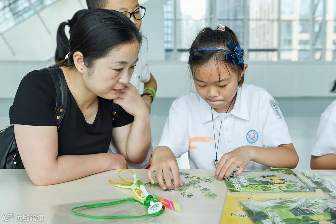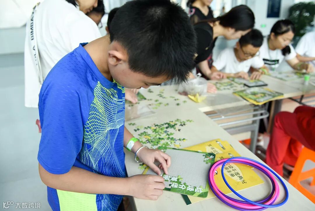 另一边的“环保比拼”拼图小分队正聚精会神的组合着手中的拼图块。拼图上“垃圾分类 美丽家园”几个大字指引着小朋友又快又好的完成这张绿色环保图片的拼凑。