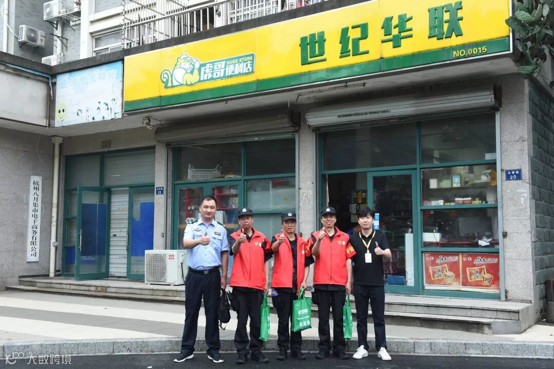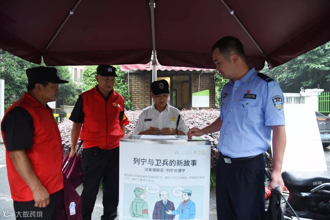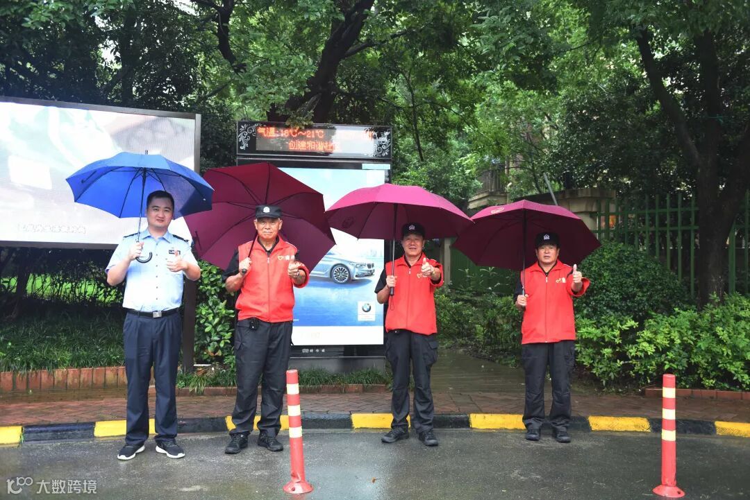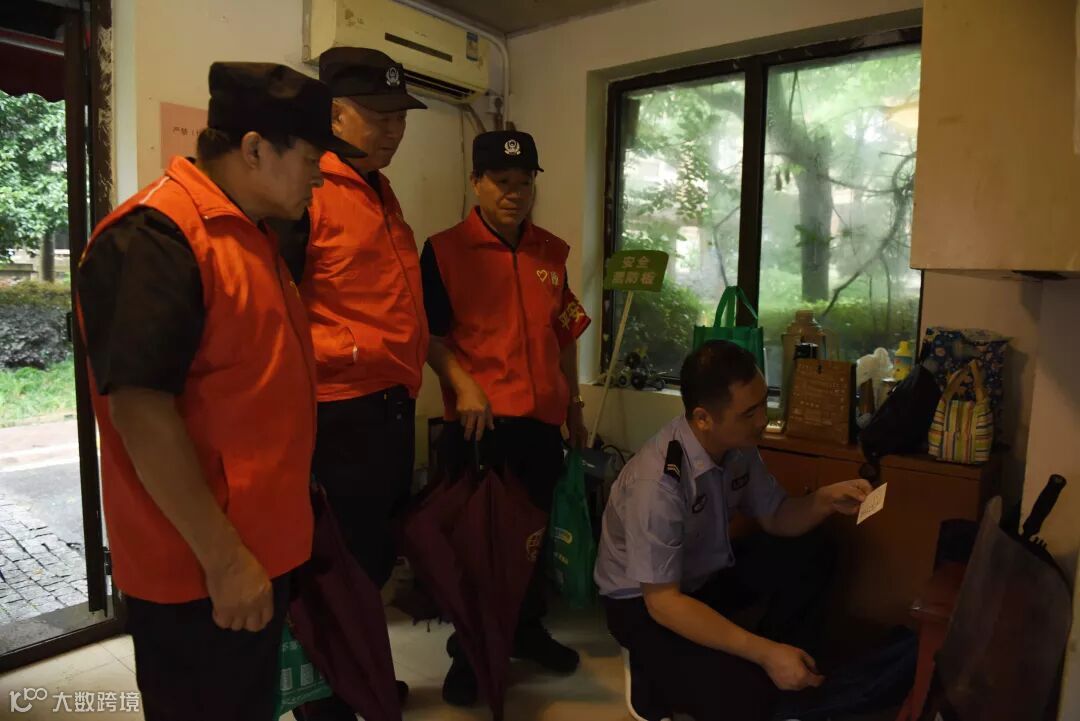 在杭城连绵不绝的雨水中,身着制服和红马甲、套着红袖章的大伯们正在小区内进行巡检……
