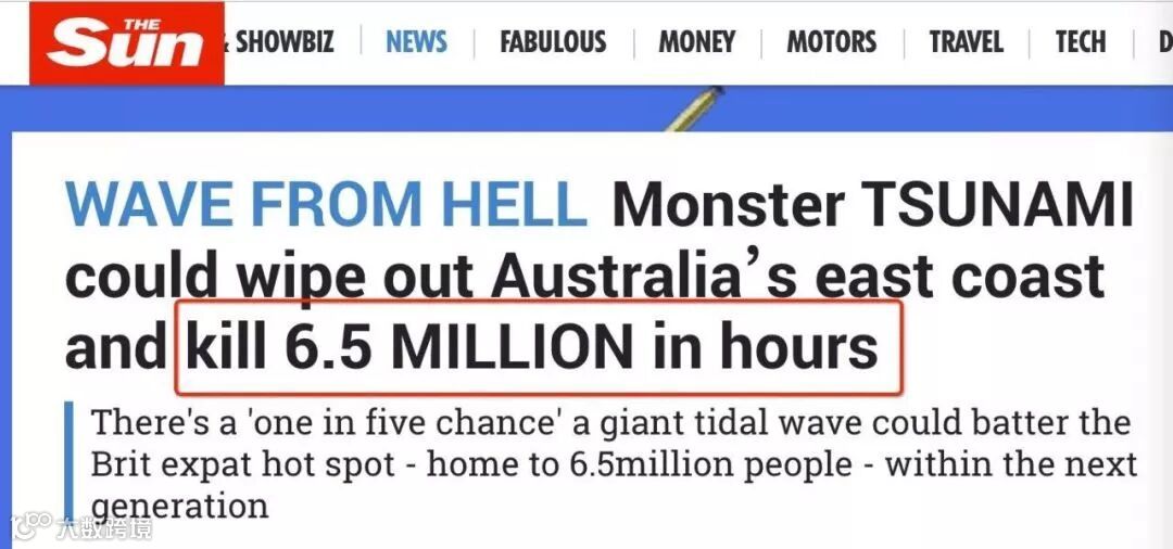 在这篇报道发布的一年前,《Sun》就用报道指出,澳洲东海岸可能在50年内发生毁灭性海啸,而概率则是让人恐慌的20%!