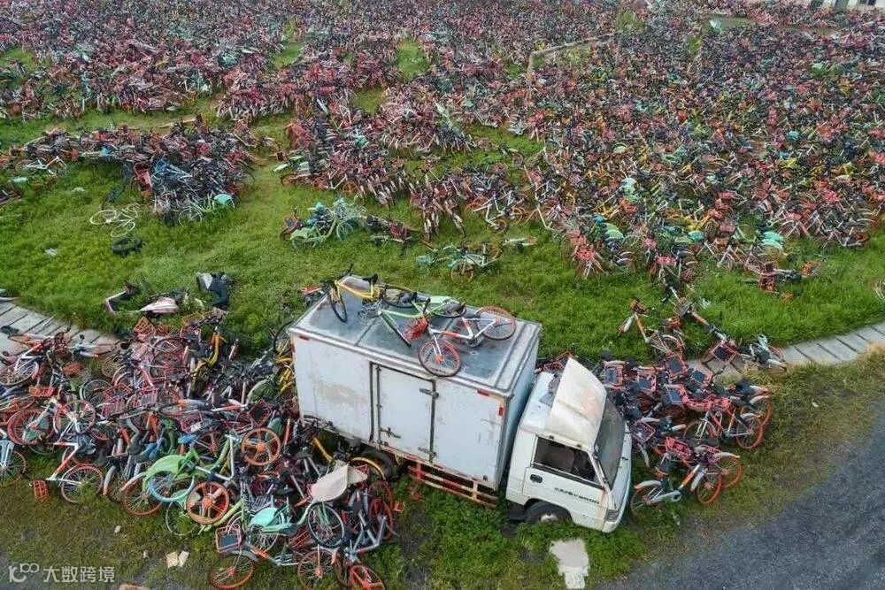 来看看原本为了代替汽车出行而诞生的共享单车吧,它们现在正躺在一个个巨大的“坟场之中”。