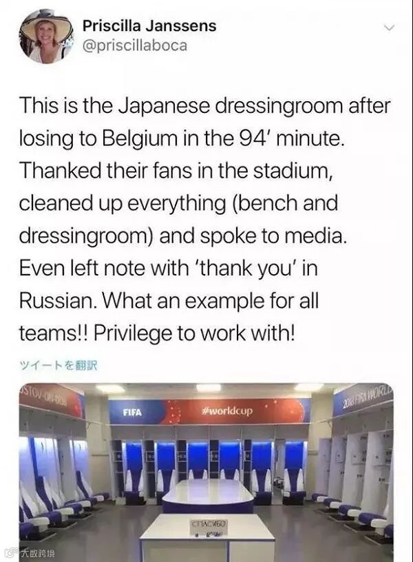 日本在第94分钟被比利时绝杀,这是他们赛后更衣室的模样。他们向球场内的球迷致谢,清理了替补席和更衣室的垃圾,与媒体进行交流。甚至用俄语留下了“谢谢”,他们是所有球队的榜样!与他们共事是一种荣幸!不忘清理所有的垃圾,还不忘用俄语说一声“谢谢”。