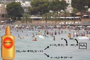 除了直接的毒害作用,2014年一篇ES&T论文还指出,防晒霜中添加的二氧化钛纳米颗粒在太阳辐射作用下,会在海水中生成过氧化氢。过氧化氢是一种强烈的氧化剂,会对海洋浮游植物造成生存压力,而以浮游植物为食的大量海洋生物可能会出现“断粮”的威胁。