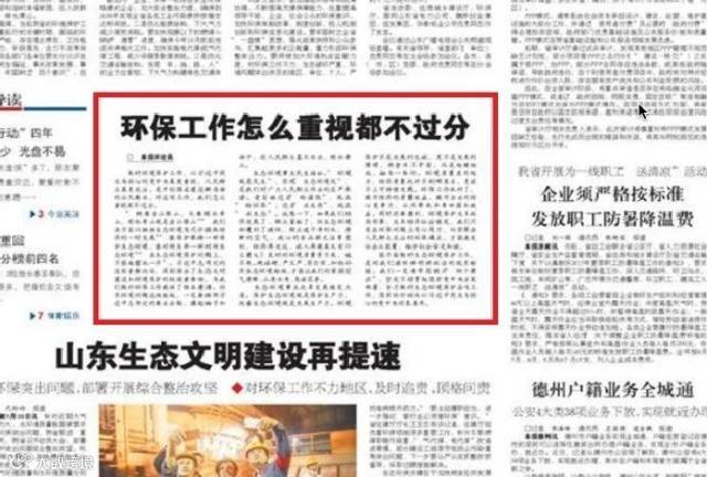 7月23日,大众日报刊发评论员文章《环保工作怎么重视都不过分》。文章指出,做好环境保护工作,以习近平同志为核心的党中央高度重视,人民群众高度关注,是开创强省建设新局面的必然要求。实现“生态环境优”,是我们对广大人民群众作出的庄严承诺。能不能做好生态环境保护工作,是对我们旗帜鲜明讲政治的现实检验。对这项工作,怎么重视都不过分。