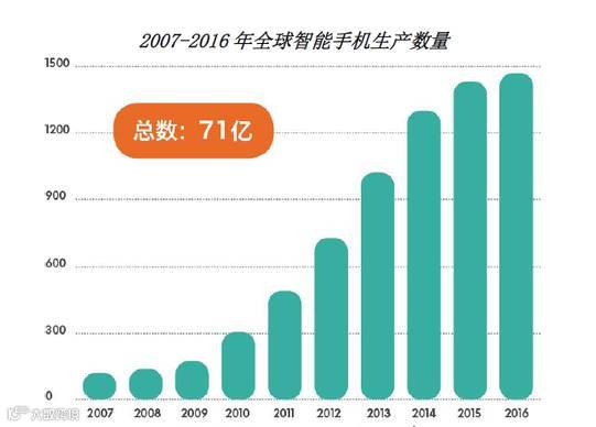 从2007年苹果推出第一代iPhone算起,智能手机在普通消费者中推广普及已有十年历史。十年间,智能手机在全球产量超过70亿部!仅2016年销量就超过14亿部!