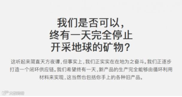 新闻总是要相关联来看,也是在今年上半年,苹果公司发布了2017年度的环境责任报告,这份报告显示,苹果正在采取各项措施减少产品材料对于矿业的依赖,逐渐停止对新资源的开采,并且将成为第一个承诺只使用回收金属、稀土和其它矿产资源的大型科技公司。在报告中苹果表示,公司计划打造一个封闭的循环制造系统,通过回收资源进行金属和稀土元素的重新利用实现对环境的贡献。