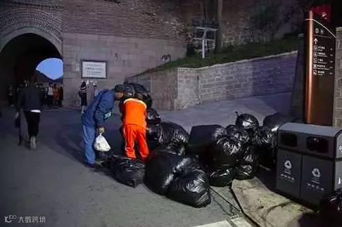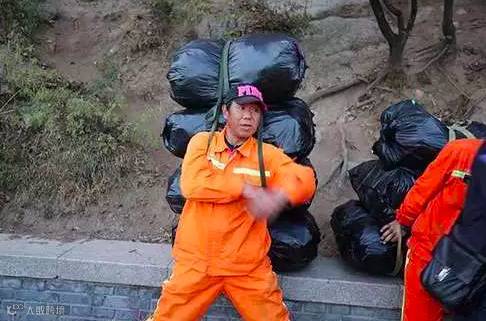 10月3号当天,八达岭长城游览游客突破六万人次,产生的垃圾十几吨,而这十几吨的垃圾都是他们一点点收集起来,用肩膀再背到山脚下,这样的日子,几十年如一日,压弯了他们不少人的脊背。