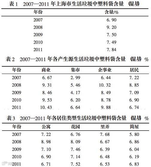 2007年至2011年间,上海市生活垃圾中塑料袋的含量