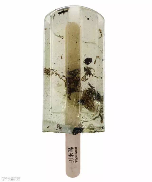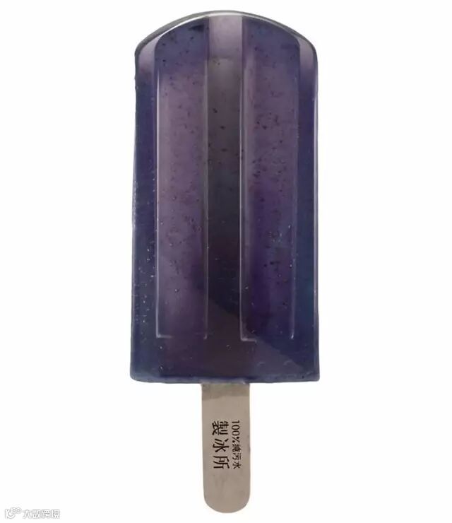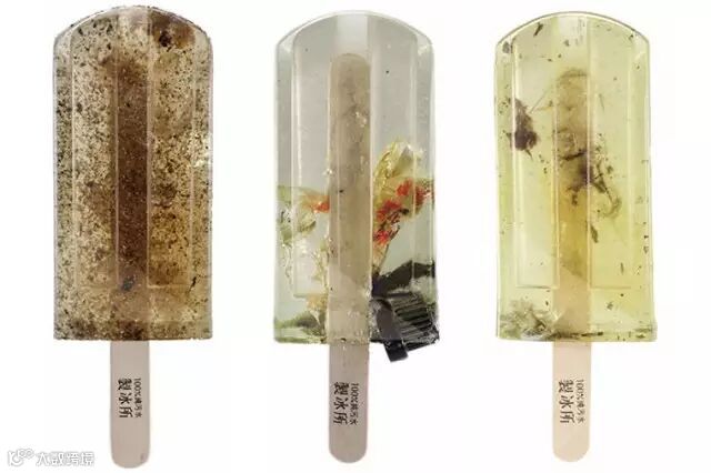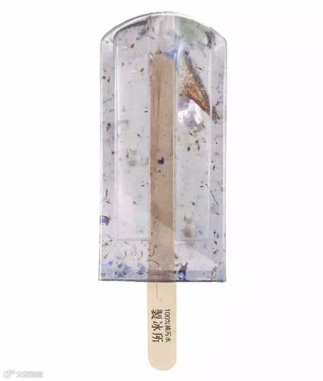 照片中这一些棒冰都是来自于台湾艺术大学视觉传达设计系学生的毕业作品,洪亦辰、郭怡慧、郑毓迪这3 位大四生到台湾各地取得河川的水源,将河川的污染现况直接制作成棒冰,取名为“ 100% 纯污水制冰所 ”的作品是美丽又令人担忧的艺术创作。