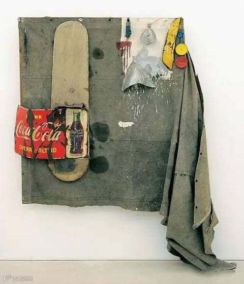 美国艺术家罗伯特·劳森伯格用破布、碎衣服等废料拼贴创作的“融合绘画”