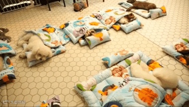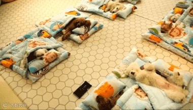 等老师们铺好一个个的小床铺,毛孩们就很乖巧的挨个睡下了...