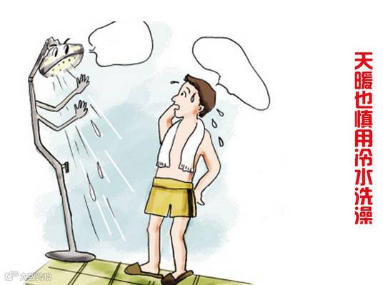 人在出汗时,皮下血管扩张,毛孔放大,血液循环加快,如果这时突然用冷水洗澡,皮下血管会立刻收缩,汗毛孔随即关闭,汗腺的分泌也立即停止,身上散热的渠道便堵死了。一旦体内的热量不能继续散发,人便会感到皮肤发热,容易患感冒,严重的更可能导致急性心肌梗死!