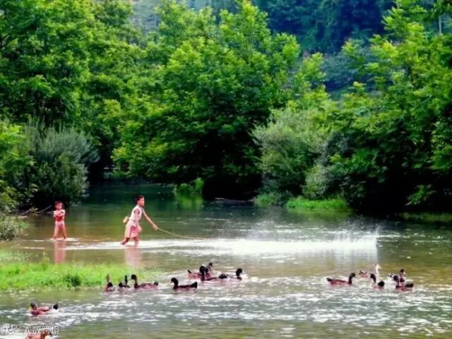 坝美四面环山,山上树木葱茏,坝里绿树郁郁苍苍。尤其是村落中的那几棵大榕树,把整个坝美裹成一团油绿。一只小花狗伏在旁边,在闭目养神。一只老母鸡领着一群小鸡,在悠闲地寻找食物,一片安静、祥和的景象。
