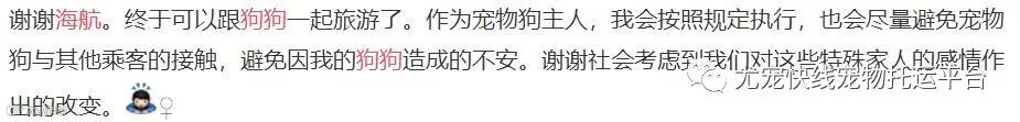 理解和接纳这一举措,也是社会文明的体现。因为宠物是宠物主人们的心灵依赖,是他们的家人,他们希望家人安心的和自己在飞机上呆在一起,而不是像以前托运一样让宠物独自呆在空荡荡的有氧舱,独自承受飞机飞行时的高空反应,孤立无援。
