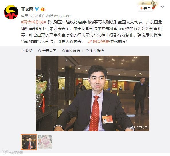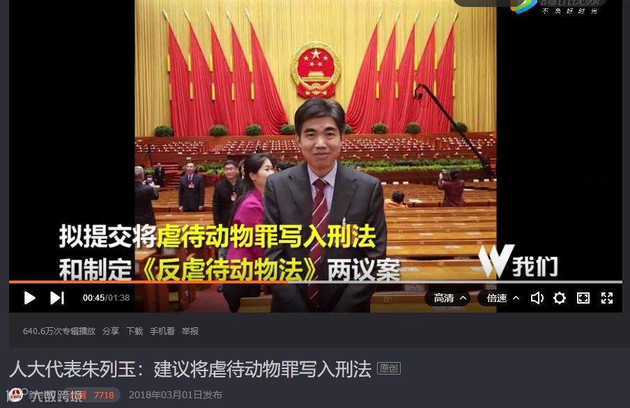 人大代表朱列玉:建议将虐待动物罪写入刑法_2018年全国两会_腾讯视频 https://v.qq.com/x/cover/zhnl6uj1glh6hja/s0562uq6hbb.html