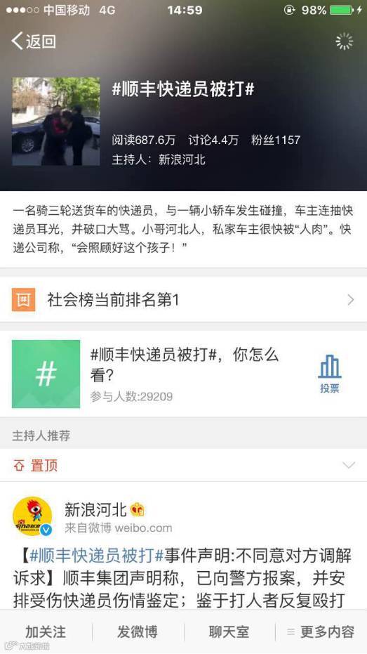 17日,一段时长1分42秒、一位司机打顺丰快递员耳光的秒拍视频在微博上引起关注,目前已经上了热搜第一。根据视频内容,在北京市东城区富贵园一区内,一位顺丰快递员骑着货运三轮车,与一辆黑色京B牌照小轿车发生轻微碰撞,随后轿车司机——一位四五十岁的中年人——下车连抽快递员好几个耳光,并伴随着“我操你MLGB的”、“臭丫挺的”、“你他妈……”、“你他妈以为你谁,丫挺的”、“我楔死你”等各种京骂。在一位路人劝阻的情况并在快递员说“对不起!”后仍然不依不饶,并说“对不起有什么用?”