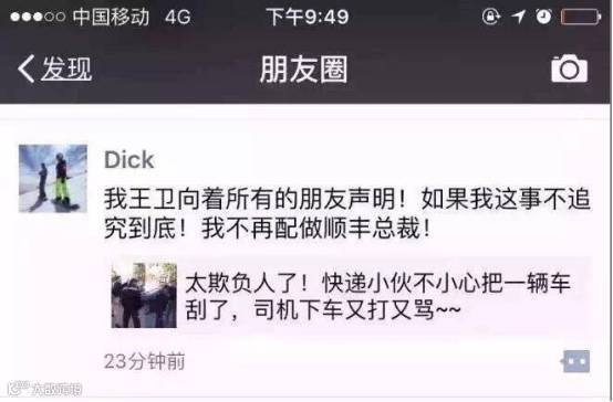 昨晚,顺丰总裁王卫在朋友圈了转发一篇【太欺负人了!快递小伙不小心把一辆车刮了,司机下车又打又骂~】的文章,并撂下话:“我王卫向着所有的朋友声明!如果我这事不追究到底!我不再配做顺丰总裁!”
