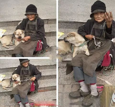 一位80多岁的婆婆,带一只狗狗,安静的坐在路边,帮小狗梳毛,乞讨瓷杯里有几元钱,见有人路过,就露出一个慈祥的微笑。婆婆耳聪目明,最小的孩子也40多了。她被孩子撵了出来,就睡在医院的角落。只有婆婆从小养大的小狗一直不离不弃的跟着她。有时候重感情的未必是人。