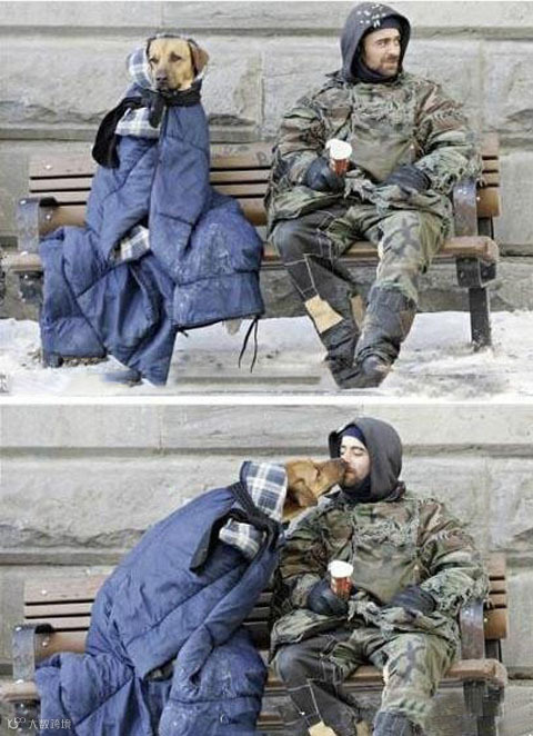 加拿大流浪汉,摄氏零下15度,用满是补丁的衣服把自己包得紧紧的,然后把他唯一的财产、或许也是最重要的财产睡袋给了他的狗狗------ 你若不离,我定不弃。