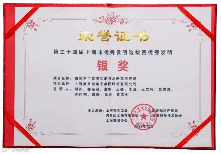 为进一步鼓励全市广大职工和青少年开展群众性科技创新活动,充分激发广大职工和青少年的聪明才智,加快上海建设具有世界影响力的社会主义现代化国际大都市,上海市总工会、上海市知识产权局、共青团上海市委员会、上海市科学技术协会、上海发明协会等单位联合举办了“第三十四届上海市优秀发明选拔赛”,经专家初评、复评和终评等环节,获奖项目正式出炉。上海复旦微电子集团股份有限公司《物理不可克隆功能技术研究与应用》项目喜获优秀发明银奖。