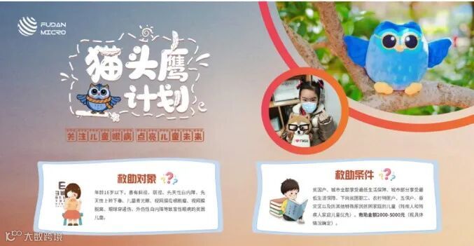 2022年,复旦微电子携手上海和平眼科医院共同发起“启明芯计划”,关爱眼病患儿,旨在对全国范围内患有九种致盲性眼病的贫困家庭进行救助,让每一名患儿像“猫头鹰宝宝”一样,拥有一双健康明亮的大眼睛和一个更加光明的未来。