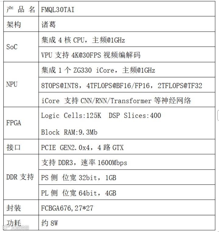 复旦微电子FMQL30TAI-悟净开发板,主芯片采用国产全新一代FPAI芯片--FMQL30TAI(以下简称“30TAI”)。该芯片内部集成了4核处理器系统(Processing System,PS),负责系统级控制与通用浮点计算;集成了全新一代诸葛架构神经网络处理器(Neural Processing Unit,NPU),原生支持Transformer,负责高效AI计算;集成125K的可编程逻辑(Programmable Logic,PL),负责传感器数据预处理和定制化功能扩展。通过异构协同机制,30TAI单芯片即可满足端侧智能应用全流程计算需求,包括预处理、AI推理和后处理三个阶段,具备集成度高、小型化、高能效、高可靠性等优势,搭配全自主设计软件工具链Icraft,可应用于智能传感器、智能算力子卡、可穿戴设备、多模态信息处理等场景,30TAI详细技术指标如下表所示。