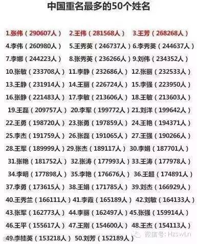 看看下面“中国最常见名字前50名”,你的熟人中有他们吗?