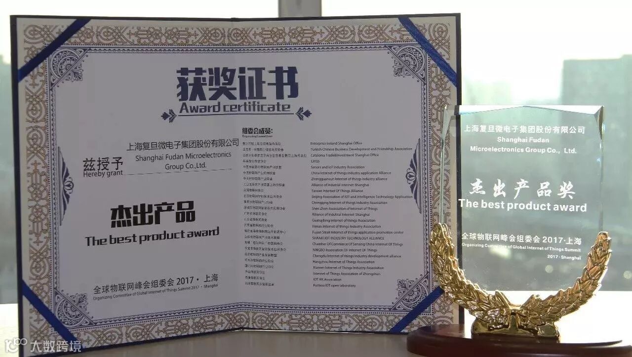 2017年12月19日,由上海市物联网行业协会联合多国驻沪领馆及二十余家全国行业协会主办,以“物联未来,G不可失”为主题的全球物联网峰会在上海隆重举行。上海复旦微电子集团股份有限公司受邀出席,并荣获本次峰会“杰出产品奖”。此奖项由各行业协会组成的专业组委会共同评定,极具商业价值。