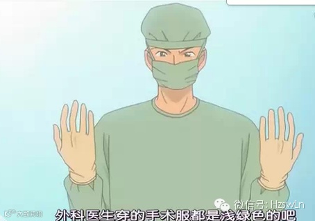 中国大部分医院采用的是绿色洗手衣和手术衣,所有的手术巾(铺在病人身上)也都是绿色的。在美国的手术录像中,蓝色的工作服居多,我觉得是因为绿色和蓝色两种颜色比较淡雅,不易对人(包括病人和医生)的心情造成较大影响,能够使人保持淡定。