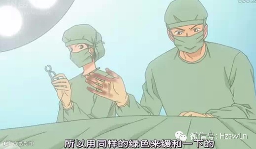 3.红色的血弄到绿色的布上呈黑色,看起来不那么bloody,这很重要,好的外科医生都不喜欢看到血,视野内要求尽量干净;