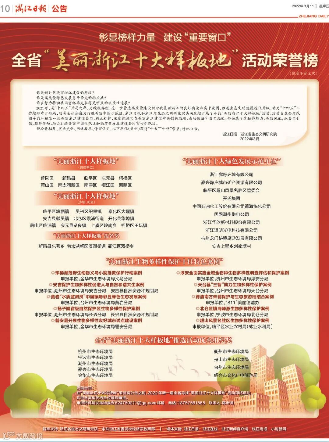 2021年,是“十四五”开局之年。为挖掘典型,进一步营造高质量建设新时代美丽浙江的良好舆论和实干氛围,推进生态文明建设迭代升级,助力“十四五”工作起好步开好局,动员全社会聚力打造美丽中国示范区,浙江日报和浙江省生态文明研究院共同发起开展了寻找“美丽浙江十大样板地”活动。