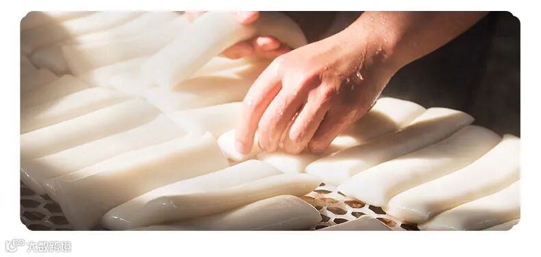 米是优质当季新鲜粳米,玲珑透亮颗颗晶莹;水是当地饮用水,别具江南风味的香甜自然。这些经过工人们的手工精心制作,最后成就了爽滑软糯的后渚桥水磨年糕。
